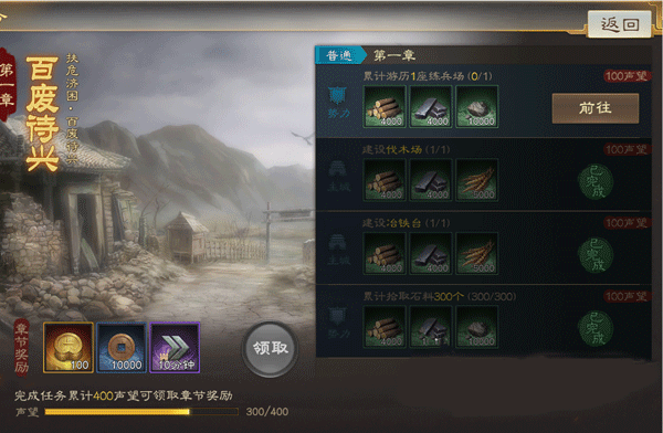 大家不要只顾着征战沙场,记得做好后勤建设,每个章节都有任务需要完成,完成获得的声望会累积,每章节有数量不等的金铢,铜币和加速器奖励,这是玩家称霸三国时代,稳步发展下去的必经之路。