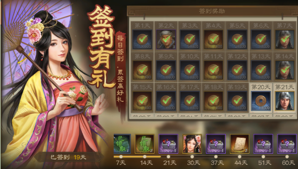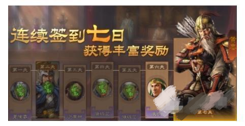 另外一个是每赛季都有的固定签到,这些签到包含了金铢,铜币,和资源材料,这是打长期作战,必须拿到手的资源,能够给玩家提供货币,武将以及武将培养的养料。