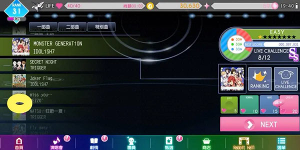 我们在主界面除了可以自由选择歌曲外,还可以选择歌曲的难易程度。爱娜娜的歌曲大体有四个难度,分别为【EASY】