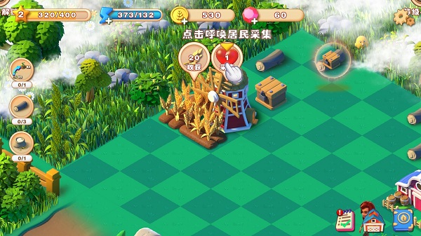 7、累计合成可以建设出来相应的加工建筑,点击采集提示按钮可以引导居民前往田地或物品收获特殊物品。