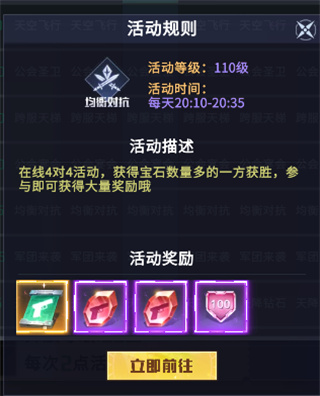 参与均衡对抗后,玩家将被传送到活动场景中进行4V4的对抗赛。在场景中会不断刷新出宝石,当角色碰撞到宝石后,会不断累积携带宝石,若携带宝石的角色被敌对阵营击杀的话,所携带的宝石将会掉落。此时敌人可以将你之前拾取的宝石“据为所有”。坚持到活动结束后,获得宝石数量更多的阵营将胜出!