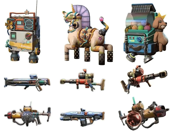 武器的外形设计也和废土主题相互呼应,都能看到“破破烂烂,逮到什么就用什么的”易拉罐手榴弹、儿童水枪式激光器、破烂收音机飞行器等等。