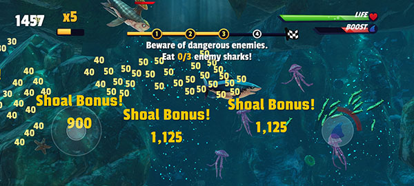 游戏里还有各种有趣的探索元素,比如珊瑚礁、沉船遗迹等,还能捡宝藏和遗物来提升能力。操作很简单,用虚拟按键就能控制鲨鱼游动,加速的话还可以用右边的鱼鳍。 hunger 足够时会进入狂热模式,感觉自己变得超级强大,可以横着走吃一切。