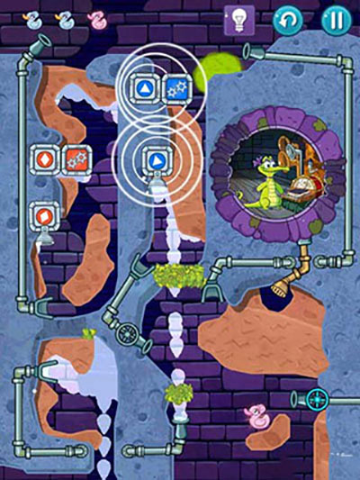2、本关首先在通向上面一只鸭子处划开道路,打开红色水闸开关。然后泥浆碰见青草变为石头;