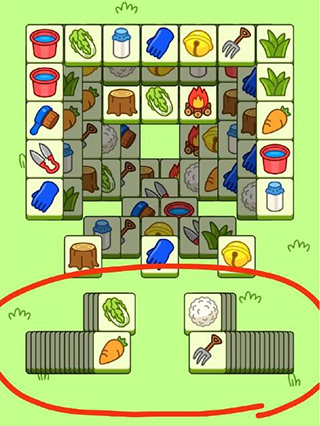大家可以看到今天布局下面有四行牌,你只能看它首张的样子,完全不能推测下一张所以小技巧第一条先消下面这四行的牌,一直消到只剩最后一张!