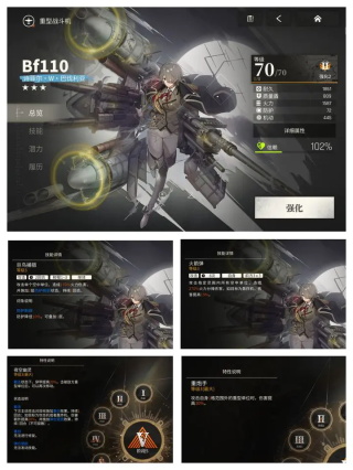 Bf110重型战斗机,3星角色,拥有单体和范围技能,特性提供穿甲和对重型伤害提升,不错的面板和容易满潜是前期的萌新之友,上位角色雷电