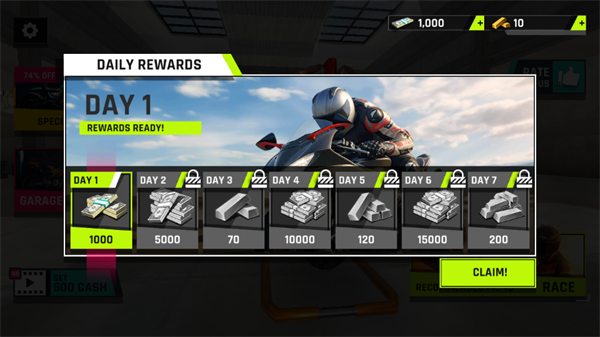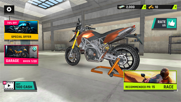 4、多样的摩托和丰富的道具,给你更多的竞速乐趣。
