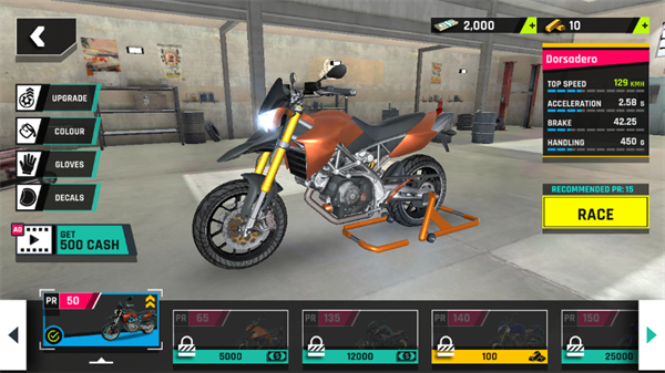 2、然后根据新手引导,购买摩托车,接下来就要进入竞赛了;