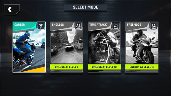 作为新手,一开始只能玩竞赛模式,升级后才能解锁其他模式。游戏的画面非常精美,UE4引擎打造的极限画质让摩托细节看起来很真实。动感的音乐和热血刺激的体验让人欲罢不能。