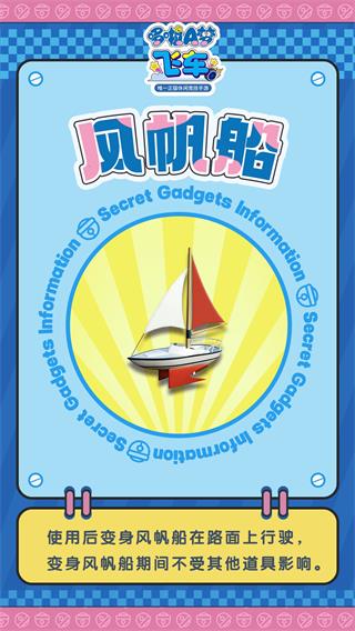 道具效果:当玩家使用该秘密道具后,一定时间内赛车的外形将会变成风帆船,在赛道中行驶。使用期间,玩家将获保护状态,不会受到其他道具影响。