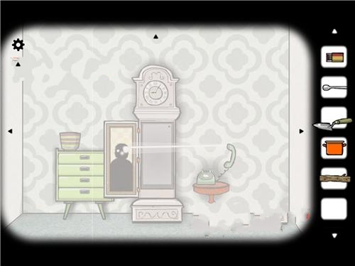 我们依然先是默认的面对有大型钟的这面,在盆栽柜子上拿到望远镜,然后一直点击盆栽,就发现一直手深了出来,又缩了回去,可以拿到第一篇相框碎片。抽屉里面可以取得螺丝刀,火柴,柜子边上还有一片碎片,房间钟的上方也可以取得一片碎片。