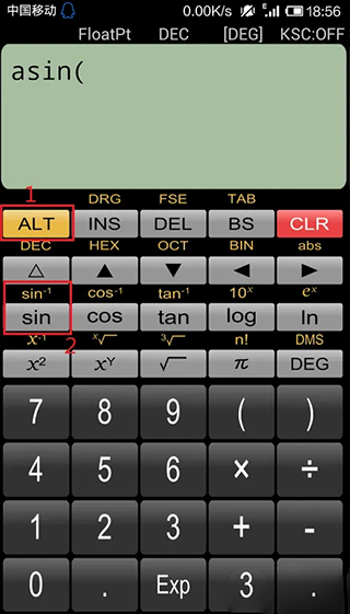 例如要算反正弦(arcsin):先按一下黄色的[ALT]键,再按黄色字体sin^-1下方的键,显示屏上就会出现asin( ,只要再键入数值即可。