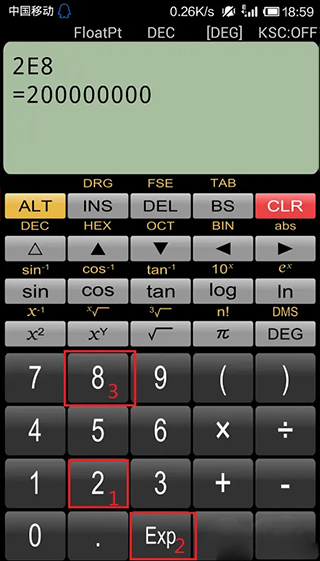 输入科学计数法表示的数值:例如2×10^8,先输入2,再按Exp键,再按8。
