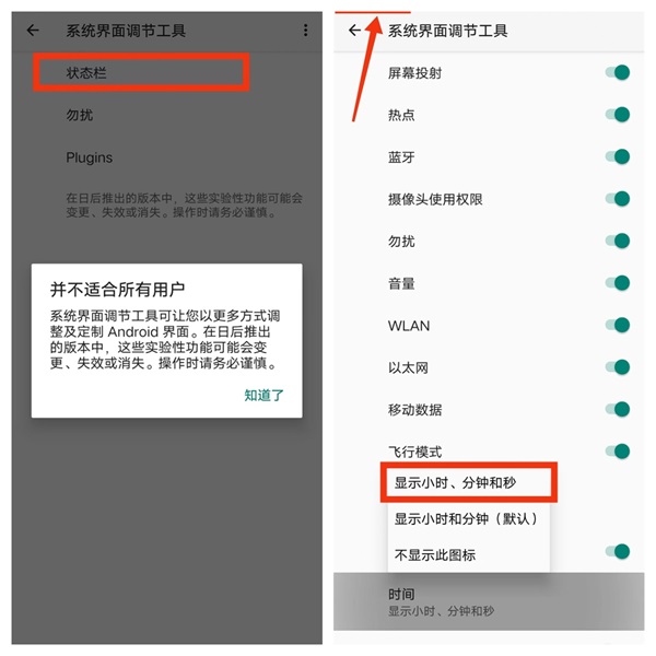 在本站下载安装「开发助手」App,在 App 首页依次点击「系统界面调节」->「继续界面调节」->「确定」->「状态栏」->「时间」,选择「显示小时、分钟和秒」。对于支持的机型在手机状态栏上即会显示秒。