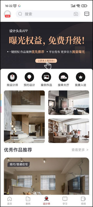 设计头条是一款集设计知识分享与学习一体的设计师平台应用,旨在为室内设计师提供学习、交流、分享为一体的平台,集前沿资讯、海量案例、教育培训、社群活动的全方位服务产品,为设计师赋能,让设计更容易~这款应用由知名设计师网站建E室内设计网精心打造,汇集全球海量优质设计案例、高清室内图集,并向全国设计师、设计机构提供身份认证、资讯搜索、设计教程、作品展示等服务,有想法的设计师都喜欢在这里找灵感,如果你是小白就更应该来这里看看!这里高效聚合了设计行业的最新时尚趋势,潮流前沿资讯及优质案例,全面筛选归类,下设多个频道可供订阅,大大节省哥们在浩如烟海的信息中筛选的时间,很合适在通勤路上掏出手机刷一刷~而且里面还包含了海量的图集和设计案例,各位学生们不愁作业作品集啦~当作一款找效果图的软件也不错了,总而言之这是一款集设计师媒体、教育、社交为一体的超好用平台,各位小伙伴们一定不要错过哦~