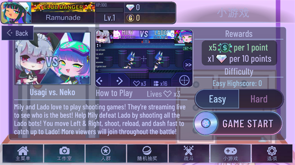 在这个小游戏中玩家需要操控界面上代表Mily的准星,左右移动或冲刺来射击出现的代表Lado的敌人。