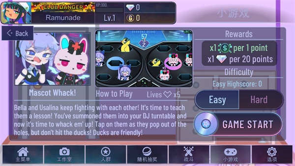 与打地鼠类似的模式,在这个小游戏中Bella和Usalina会从界面中的DJ工作台上左右两个碟子中的6个孔出现,其中还包括鸭子。