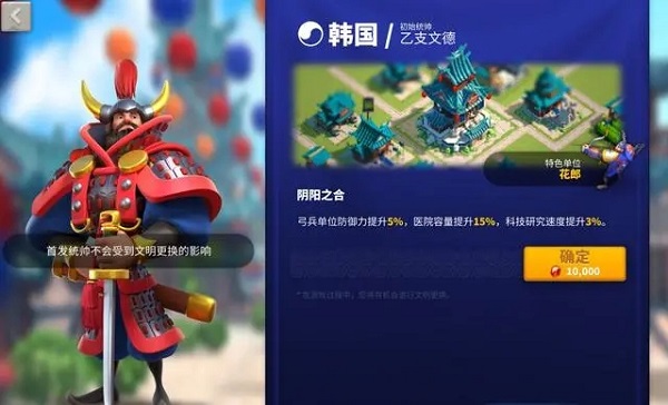 韩国 【弓兵防御力+5%】、【医院容量+15%】、【科研速度+3%】