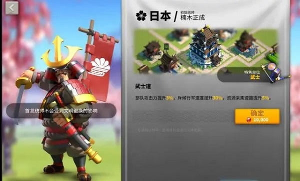 日本 【部队攻击力+3%】、【斥侯移速+30%】、【资源采集速度+5%】