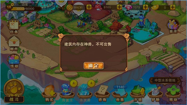 9、功能图标中,点击“铲除”图标,弹出是否铲除Tips提示。点击“确定”按钮,铲除领地的同时,获得相应金币;