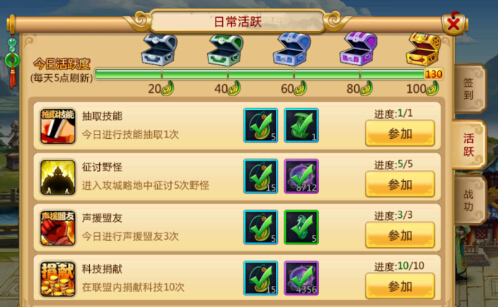 游戏中武将技能的获得主要方式是通过技能抽取。每天会有免费的技能抽取机会。技能抽取分绿宝箱跟紫宝箱两种,区别是绿宝箱的技能抽取是随机的1-3不等每次给予4点兑换石。而紫宝箱的抽取是五次必给一个3J技能,每次必给与40点兑换石。