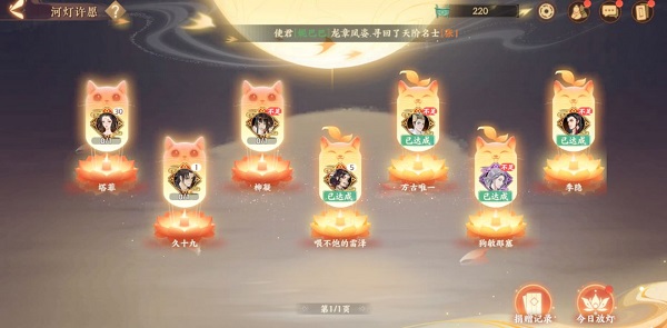 在古时人们喜欢将自己的心愿写在一张纸条中并放在花灯里,然后将花灯放入河水中,希望通过这种方式祈福许愿。而在雅社的河灯许愿中,这种习俗被延续了下来。在这里使君可以看到雅社其他成员许下的愿望,如获得信物:武则天、获得信物:卫青等,如果使君拥有大量其他成员想要的物品,则可以选择帮助这位成员完成心愿。