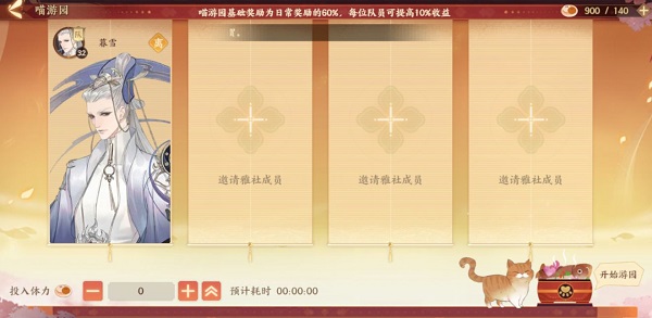 喵游园是一个佛系系统,和委派名士有点类似,只需要投入一定体力值,将猫灵寄养在此并让其开始游园,等到游园结束,就能获得猫咪带回来的奖励收益。同时,使君还可以带着同一雅社的成员一同开启游园。