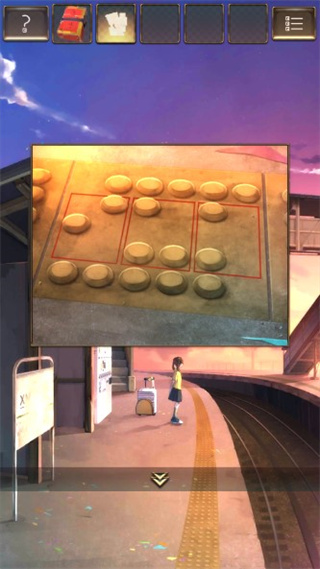 5、向左来到候车厅,查看垃圾箱,对照拼图图案,依次点击圆点,打开垃圾箱获得【钥匙】。