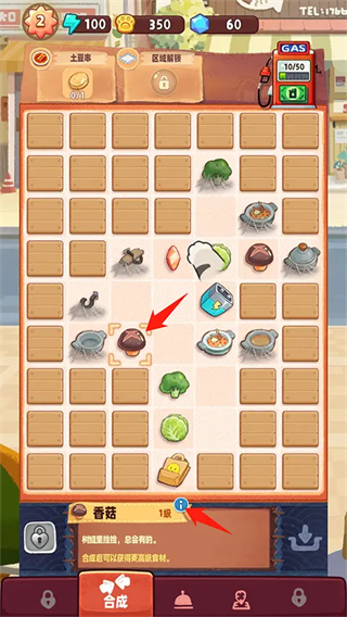 1、在合成界面,选择需要查看的食物或厨具,这里以【香菇】为例,点击【蓝色】小图标,
