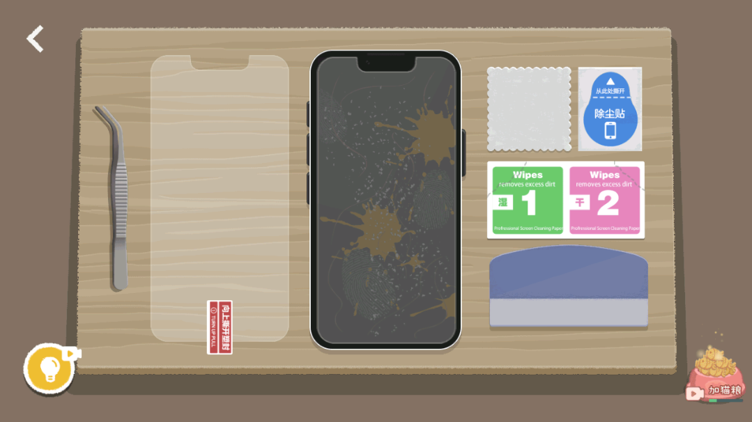 1、进入关卡之后,玩家可以看到在桌面上有一个碎屏的手机,和很多的道具;