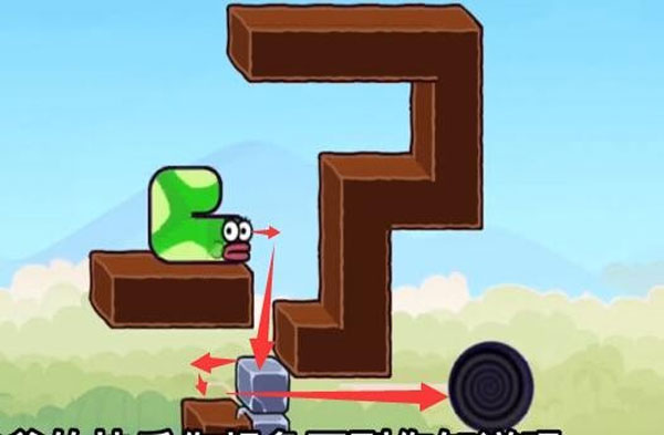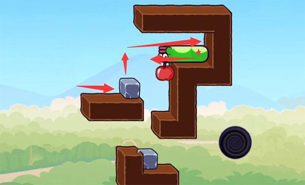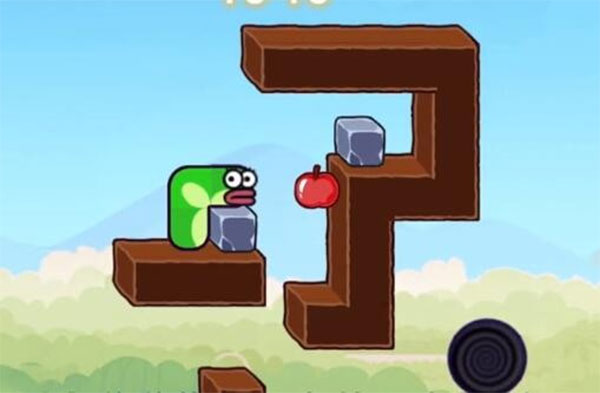 1、移动贪吃蛇,借助左侧的石头和苹果将右侧的石头推下去,然后吃掉苹果