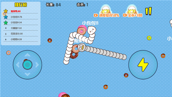 1、发育期:在游戏的前两分钟蛇蛇们都很短,击杀获得的能量很少而加速还要浪费能量,本身长度也不够无法对敌人形成有效的威胁。尝试击杀是可以的,但是更重要的是发育,吃闪亮的飞行能量块能让你迅速长大!