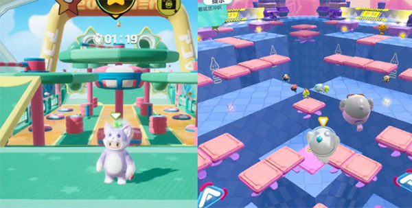 元梦【蹦蹦山谷】这张地图以山谷为背景,以弹跳为主要机关,另外加入了箱子、滚木、波形障碍等。而蛋仔的【山谷跃动】同样以绿意山谷和清泉瀑布为背景,同样是跳跃翻越地形,穿过滚木障碍。这两张图元素重合性略高,笔者觉得蛋仔的画面会更清新可爱一点。