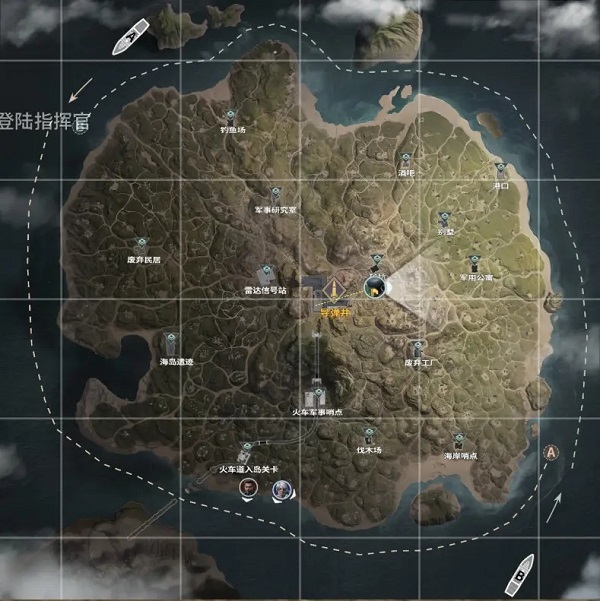 从地图上可以看到,临近海岸分布着众多据点,包括钓鱼场、海岛遗迹、海岸哨点等,而港口与火车道入岛关卡通常会有较多队伍登陆,大家可以自行选择是否避开这些区域。
