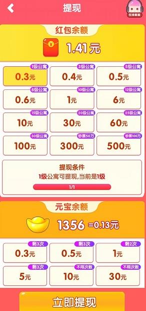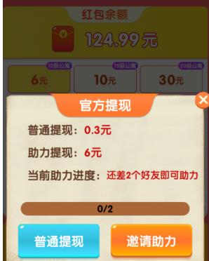 红包余额提现的档位就比较多了,所以更多人会比较关注这个红包余额提现,每个档位的左上角都注明了公寓等级,从界面上看想要提现就只需要将公寓等级升到相应的等级后就能够提出来,小编大概玩了几天,前面的小金额提现确实是如此,达到对应的公寓等级就提出来了,但是到了12级公寓6元提现的时候就不是这样了,点击提现会提示让我邀请两名好友助力才能提出6元,如果不能邀请到两名好友就只能选择普通提现,这样就只能提出3毛钱,6元变成了3毛钱,大大缩水。
