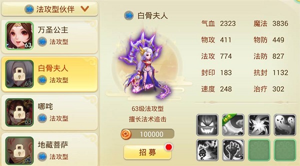 而在输出伙伴的选择上就可以随意一点。想要输出暴力可以带孙悟空和紫霞;想要龟速守尸可以用地藏菩萨;想让伙伴智能点杀可以用白骨夫人。多看看技能说明,主要还是根据自己的需要来决定。