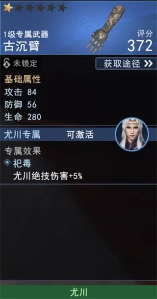 尤川专属武器绝品武器:天工玄铁臂。专属效果祀毒(绝技伤害+15%),附加效果破坚(战斗中攻击+2%)