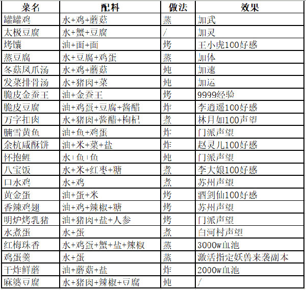 7、加门派声望:目前有三个食物,怀抱鲤(水+炖鱼)、腩雪黄鱼(油+炸鸡蛋+鱼)、烤乳猪(烤人参+油+盐+猪肉)。