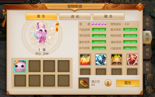 1、“魄之石”可以重生宠物,重置宠物的各项属性,包括已经学得的技能也会初始化,并还原宠物的进化次数。