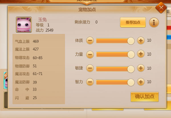 宠物升级可以获得 潜力点,潜力点可以手动分配到宠物的基础属性上面。