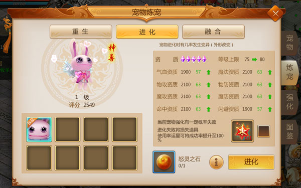 2、每次融合后,主宠的每项资质增加一定数值。增加的数值的多少取决于主宠和副宠的各项数值的多少,即:好的宠物+好的宠物=更好的宠物。