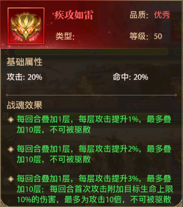 甘宁的战魂可搭配【疾攻如雷】,效果是叠加攻击和命中率,因为甘宁的技能特性,我们可以尽量提升他的攻击就可以了。