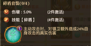 甘宁的配饰选择【碎盾】套装,凑够一套时能获得技能【碎盾】。甘宁主动攻击时,可以对镇卫额外造成自身攻击24%的真实伤害。因为甘宁技能是优先攻击镇卫的,所以这套配饰与他绝配,君主们记得佩戴。