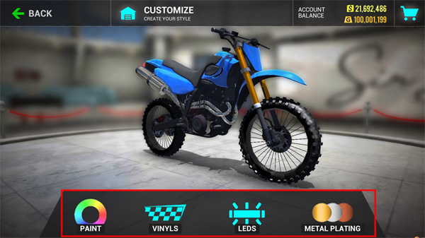 操作简单,左边控制方向,右边刹车和油门,轻松上手。改装功能也很棒,玩家可以随意更换车轮、颜色、灯光等配件,打造属于自己的个性摩托。游戏音效逼真,引擎轰鸣声让你仿佛身临其境。