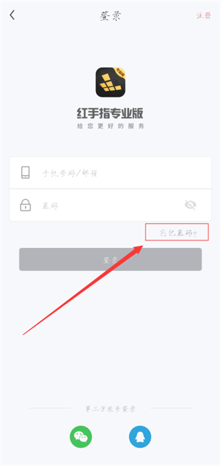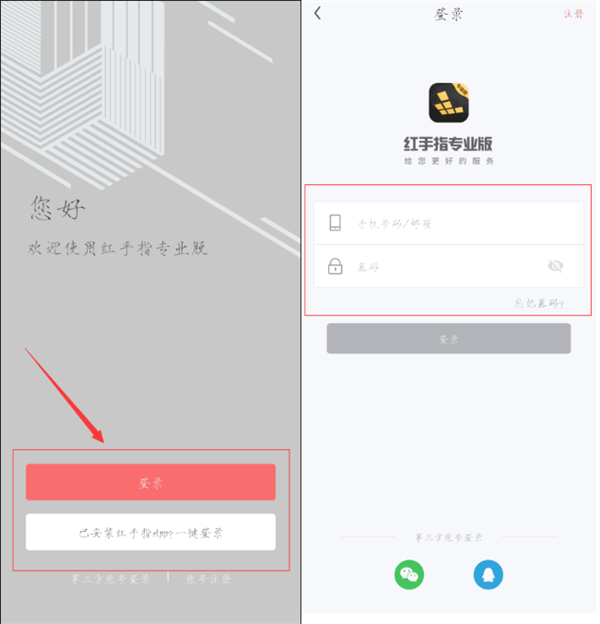 1、打开红手指专业版APP,点击登录按钮,用户在界面输入账号及密码便可登录红手指专业版APP,下次无需再次登录;