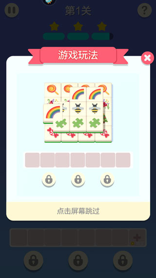 3、你需要通过点击棋盘上图标,3个相同的图标即可消除;