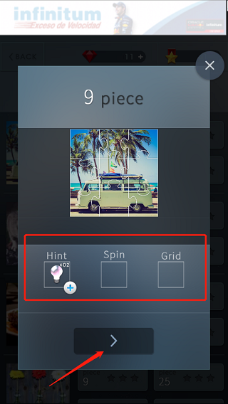 3、选择游戏难度,Hint代表游戏提示;Spin代表难度增加,打开图片;Grid代表去掉网格,