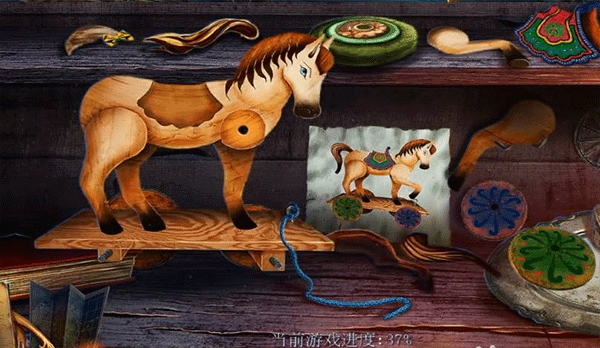 3、最后一个谜题拼装木马,玩家要照图装木马,四个轮子安在木板四周,坐垫放在马背上,蓝色绳子系在马脖子上,就拼装好了。