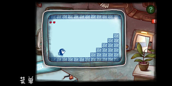 去右边的场景把左下角的电路解开。从这个场景得到水壶,拿着水壶去楼下的鱼缸里打水,再回到这个场景给这个植物浇水,得到苹果给小飞虫吃,得到钥匙把机器人解锁。