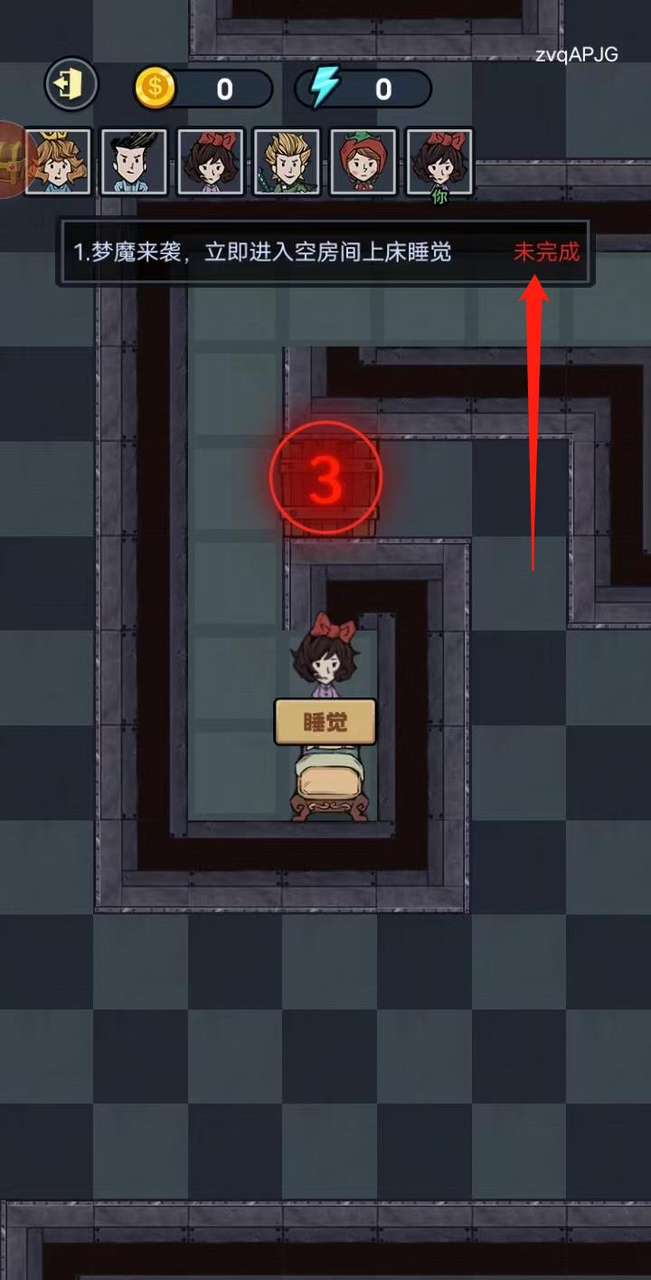 4、然后玩家需要梦魇来袭之前(在倒计时结束之前),进入没有人的房间上床睡觉;